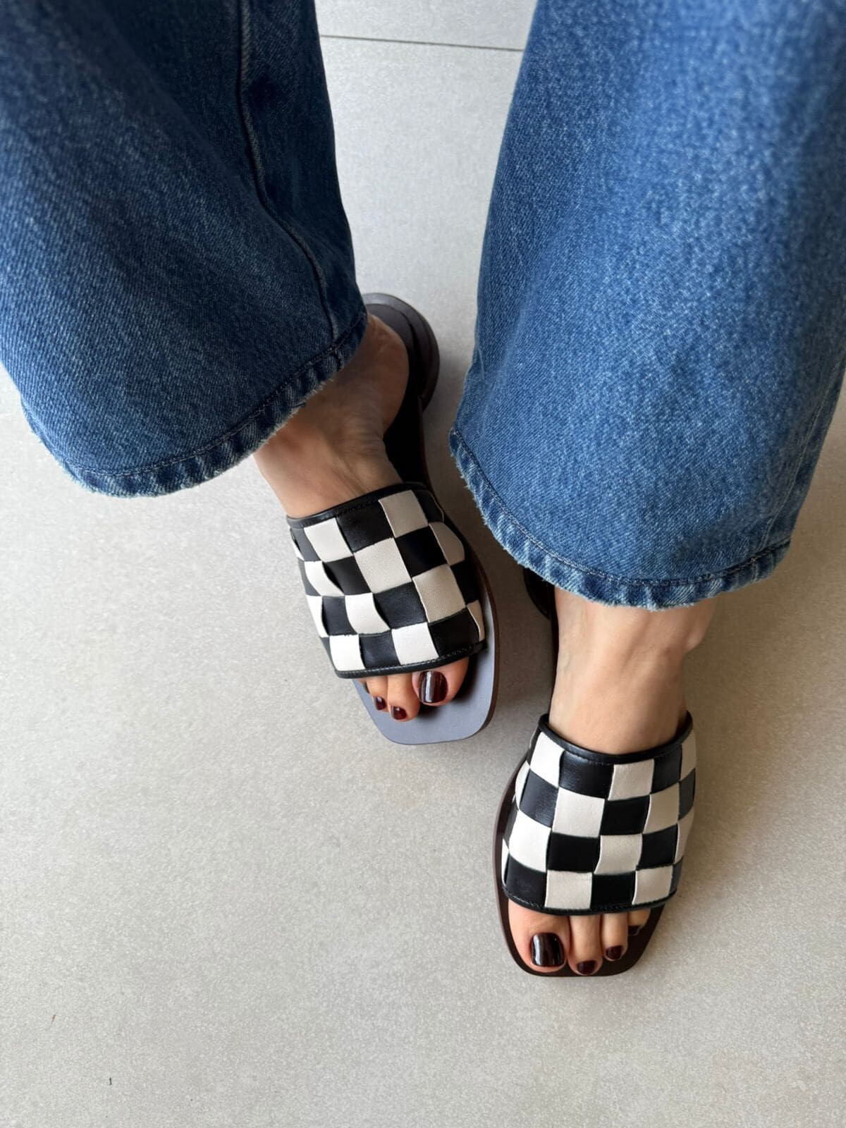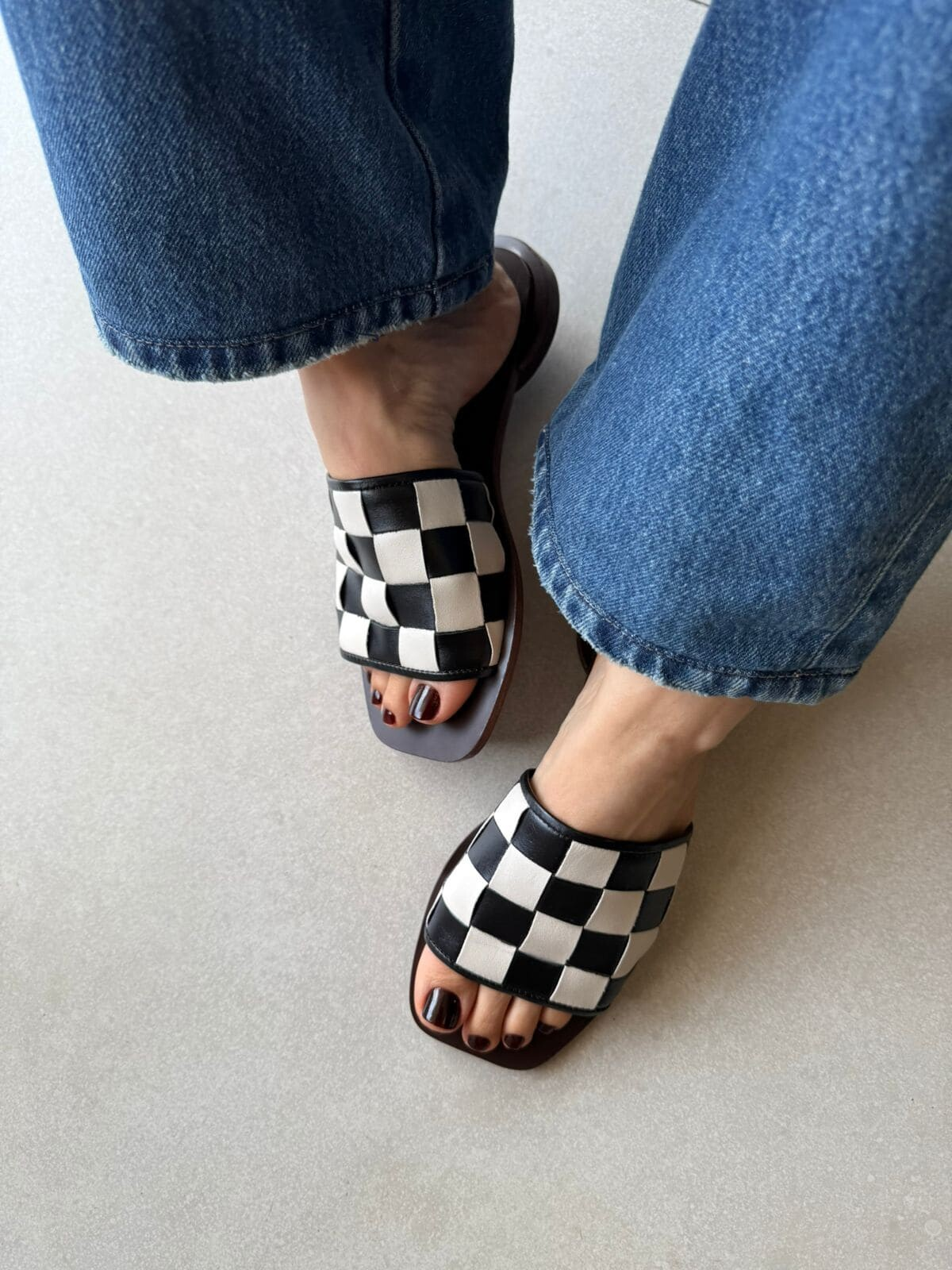 Um clássico que une arte e design. O Tamanco Feminino em Couro Artemis celebra a estética do xadrez de forma elegante, com tiras largas confeccionadas em couro nobre entrelaçado nos tons preto e off-white, criando um visual marcante, sofisticado e atemporal.
