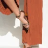 Elegância escultural, presença atemporal. A Sandália em Couro Feminina Riace traduz a essência do design sofisticado em uma peça marcante e feminina. Confeccionada em couro nobre com acabamento metalizado, ela envolve o pé com tiras suaves e estruturadas que valorizam a silhueta com delicadeza. O destaque fica para a tira acolchoada no tornozelo, que cria um efeito visual contemporâneo e sofisticado, enquanto a tira frontal mantém o design minimalista e elegante. O salto médio em madeira natural acrescenta autenticidade e equilíbrio, trazendo conforto e estabilidade ao caminhar. Uma sandália que transita com naturalidade entre o refinamento do dia e a elegância da noite.